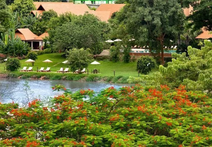 The resort is built in traditional Lanna style, in fine harmony with the surroundings. The buildings are spread out over the large plot, which consists of shady paths, lotus ponds, flowerbeds and a large lawn with sun loungers where you can relax and enjoy the view of the river.