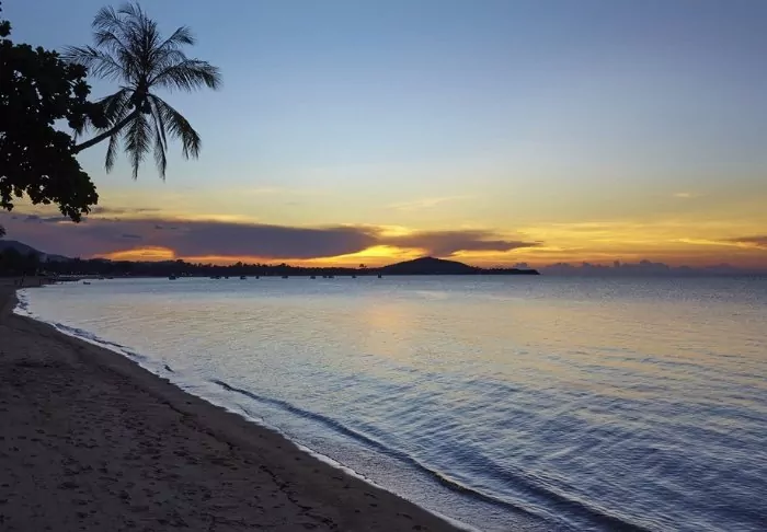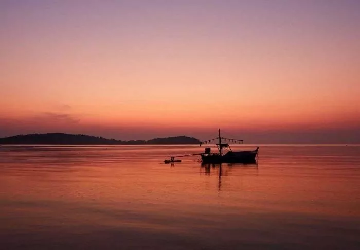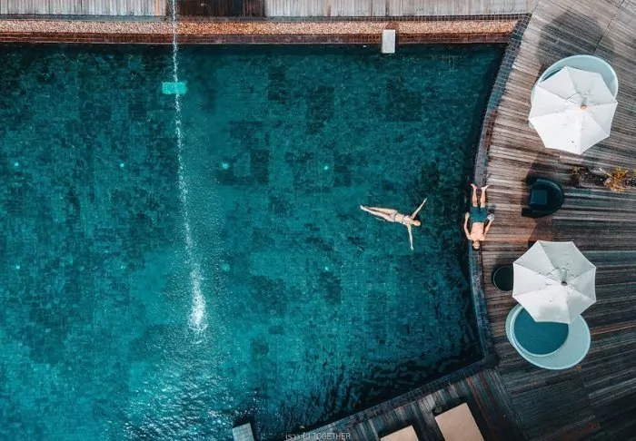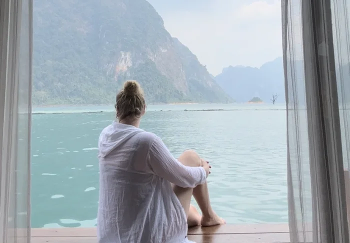 The sun is setting. Before changing for dinner, you jump in the “rooftop” pool for one last time today. From here, you can glimpse the sun, which is about to set over the Andaman Sea. The sky is a purple-red colour and the cicadas are singing around you.