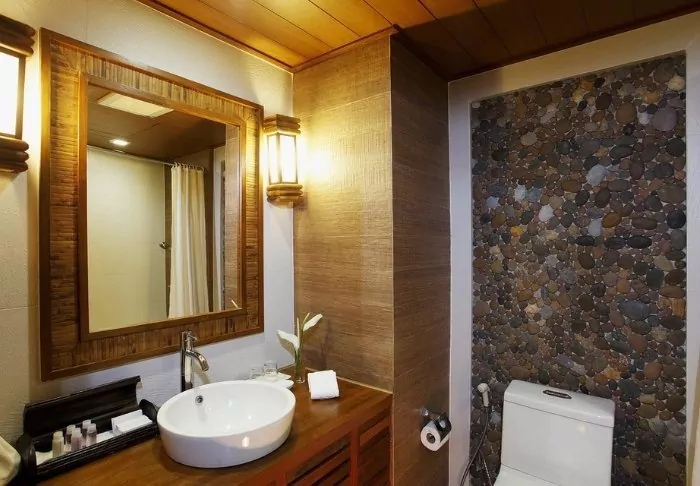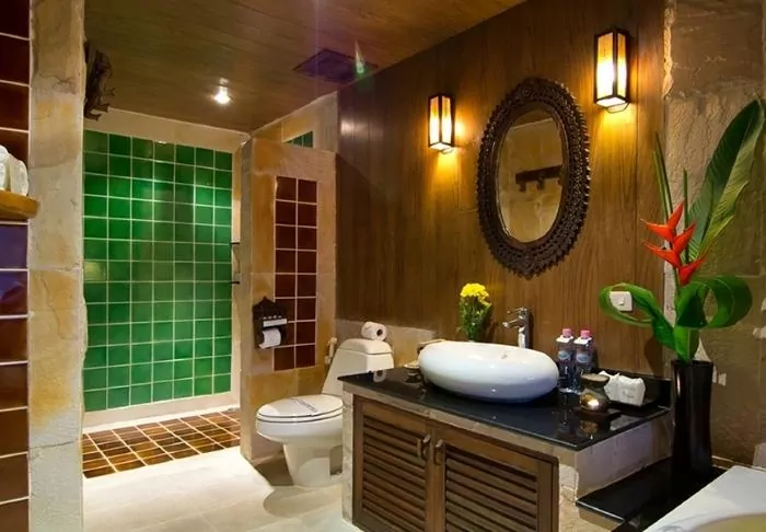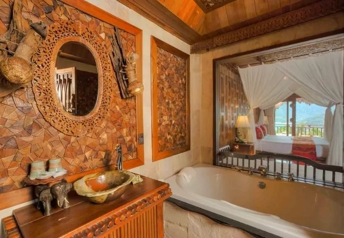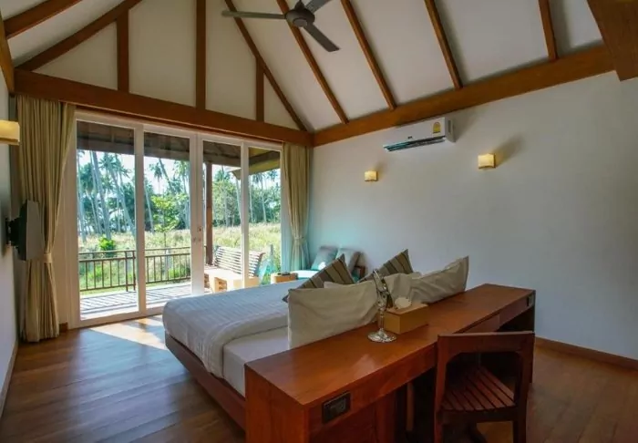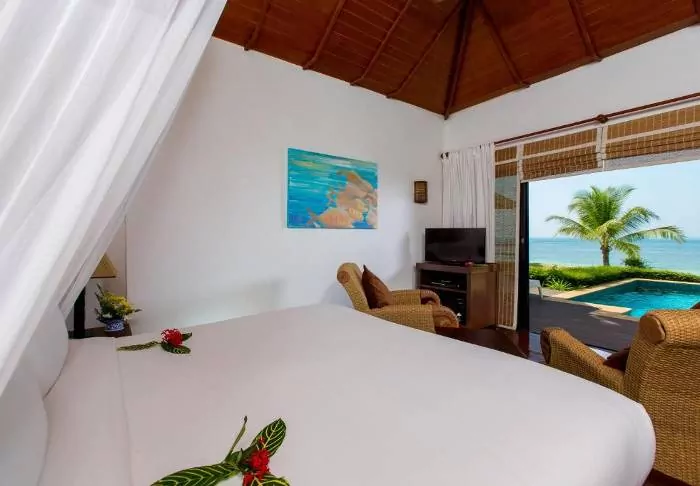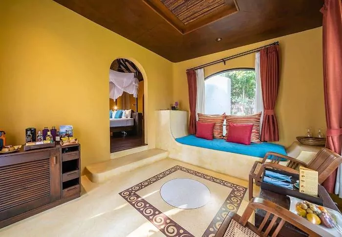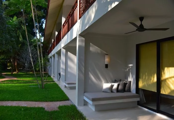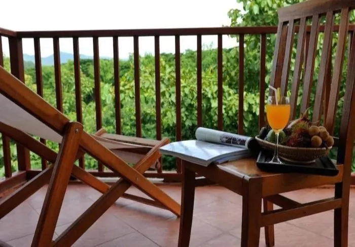 The resort has 50 spacious and traditionally appointed rooms. All rooms have free Wi-Fi, air conditioning, safe, minibar, coffee and tea making facilities, iron and ironing board, TV, telephone, desk, hair dryer and a bathroom with a separate bath and shower. The balcony overlooks the tropical garden,