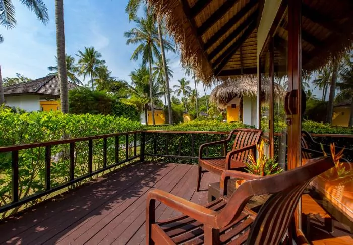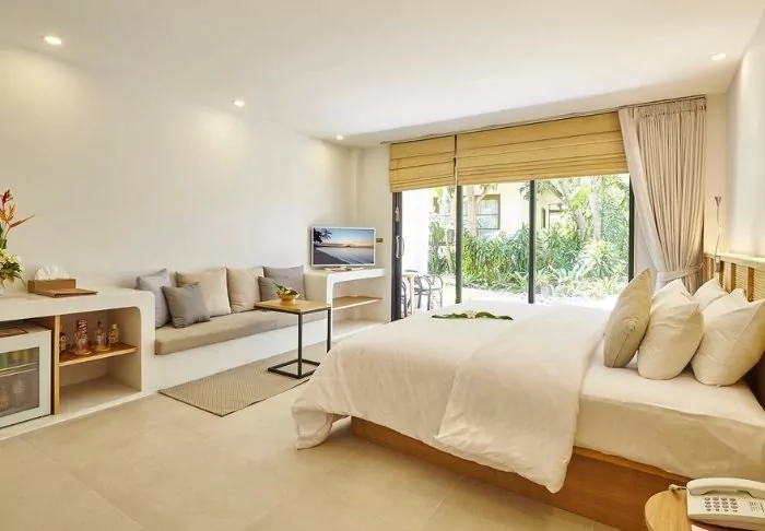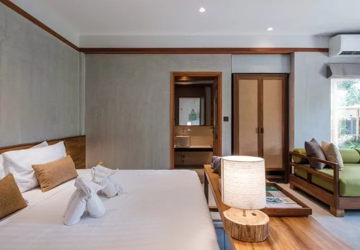 The resort is surrounded by palm trees and tropical trees. Situated in the midst of the lush gardens are the bungalows and the free-standing hotel building with views and access to the pool. The resort has 80 well-appointed rooms of at least 35 m2, which combine elegance and Thai charm with natural materials. Each room is furnished with comfort and tranquillity in mind. All rooms offer Wi-Fi, air conditioning, a mini bar, a safe, a TV and tea and coffee making facilities. From the small sofa bed, you can look out over the lush gardens. Each room also has a furnished terrace or balcony, where you can enjoy the surroundings and the much-needed peace. The bathroom has both a rain shower and a bathtub, as well as a hair dryer and complimentary toiletries.
