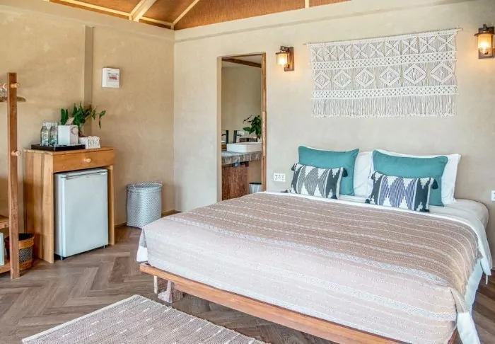 The rooms are bright and spacious and decorated with textiles in calm earthen colours. They are equipped with modern amenities such as Wi-Fi, air conditioning, ceiling fan, minibar, safety box, complimentary bottled mineral water, electric kettle for making tea and coffee as well as a wardrobe. The rooms also have a nice bathroom with shower, and you will also find toiletries, bathrobe, slippers and pool towels for free use.