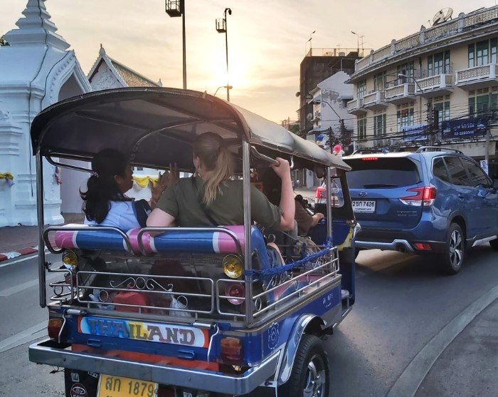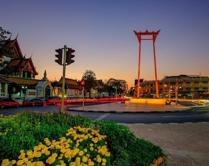 Back in the tuktuk, you continue past the 27-metre-high Giang Swing, a historical and cultural landmark at Wat Suthat Thepwararam temple.