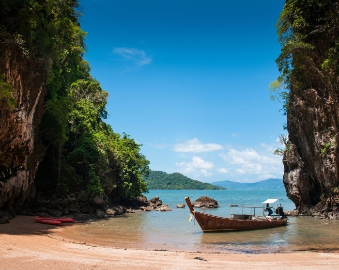 You’ll continue by long-tail boat to visit the islands of Koh Aung and Koh Talabeng with their iconic limestone karsts and picturesque bays. At Koh Talabeng, an unforgettable kayaking trip around the island awaits you, where you’ll experience its untouched nature, magnificent limestone karsts and fascinating caves.