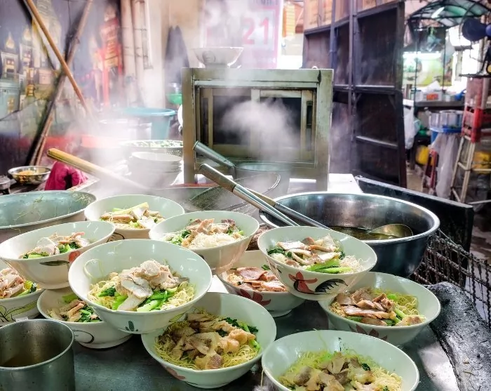 The next destination is a local night market, giving you time to browse stalls that sell local delicacies like braised pork leg (khao kha mu), coconut pudding, and sticky rice with egg (bua loi khai waan).
