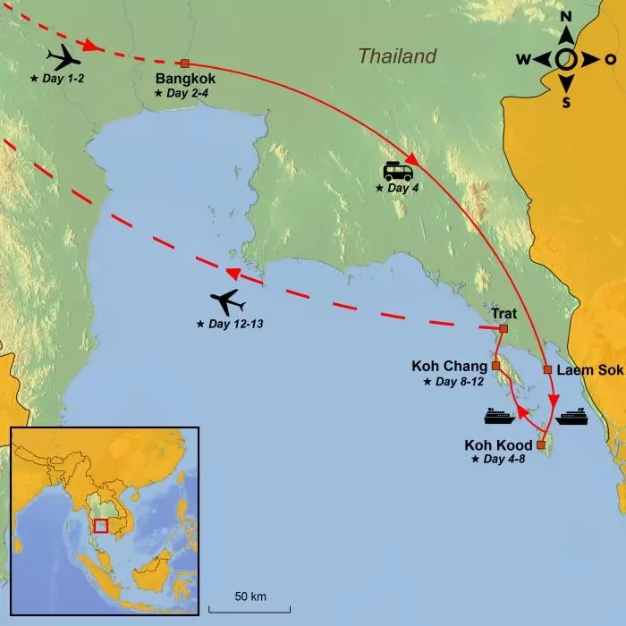 From the city, the journey continues with an adventurous island hopping in the northern Gulf of Siam to the islands of Koh Kood and Koh Chang.