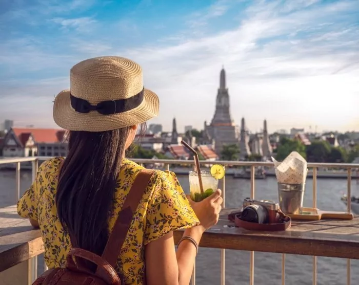 The evening winds down at a relaxed rooftop bar by the Chao Phraya River, with views of the illuminated Wat Arun temple. It doesn’t get much better than this!