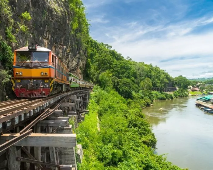 The morning is yours to savour the delightful surroundings until checkout around 11 am. Afterwards, you’ll be taken upriver to the pier, where you’ll disembark for lunch at a local restaurant. Next, board a scenic train ride on the Death Railway in its historic carriages. The train journey takes place along a track elevated above the beautiful landscape and River Kwai.