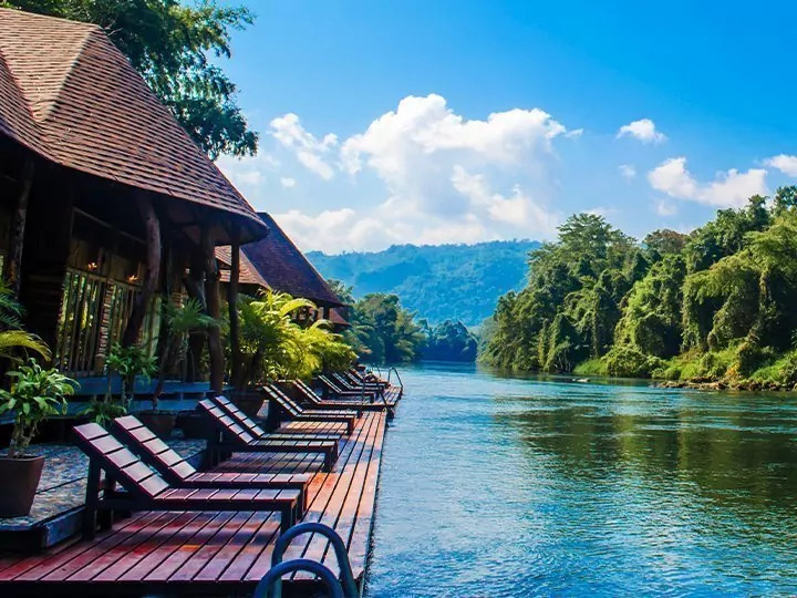 After a hearty breakfast, you will check out and be taken by longtail boat to River Kwai Jungle Rafts, where you can leave your luggage until check-in later in the day.