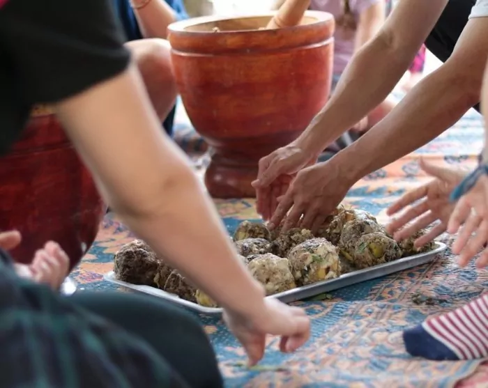ChangChill also has its own herb garden, where you’ll learn about which plants, leaves, roots and herbs are used as medicine for elephants. Many of these are also highly nutritious. Despite eating around 120 different plant species, it is said that elephants only absorb 40% of nutrients and therefore need extra in the form of supplements. The next activity involves making elephant snacks or vitamin bombs using ingredients from the herb garden.