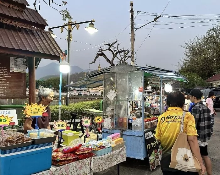Every evening, Walking Street transforms into a lively night market, where you can explore all the food stalls and be tempted by the local cuisine. The evening’s meal is enjoyed on a blanket at a low table, just like the locals. Here, you can also admire the Wat Chong Kham Temple, which is reflected in the lake of the same name behind it.
