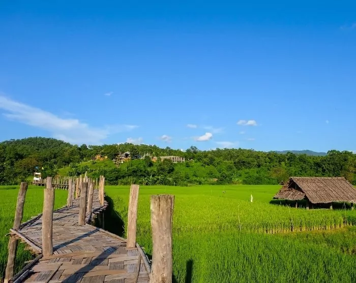 The tour continues to the iconic Sutongpe Bridge. The impressive bamboo bridge stretches across lush rice paddies and connects a village to the Buddhist temple of Wat Phu Sama. Sutongpe Bridge is one of Thailand’s longest bamboo bridges, about 500 metres in length. It was built by local villagers and monks as a symbol of cooperation and faith. The bridge still plays a role in their everyday lives, as monks cross it daily on their alms rounds.