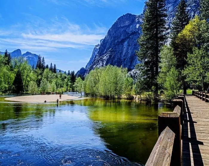 In Yosemite Valley, it is also possible to rent a bicycle, and you can use the paved cycling paths to ride from one waterfall to the next, while you simply enjoy the sight of the huge rock walls and trees around you. A good place to enjoy a snack is at the small stretch of sand at Swinging Bridge Picnic Area, where you have a view of the waterfall Yosemite Falls.