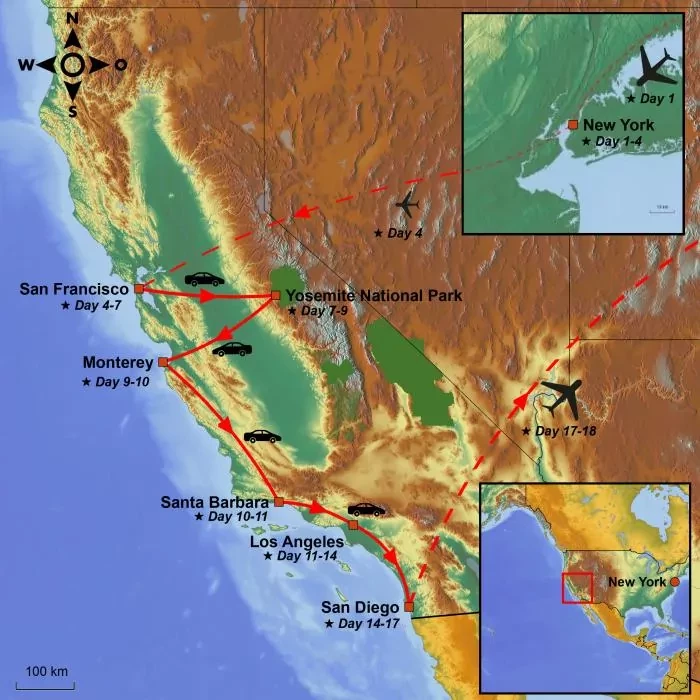 You check out of your hotel and book a taxi or an Uber to the airport in New York. The hotel can also help book a transfer for you. You will find information about which airport, departure terminal and departure time on your itinerary. From New York, you will fly west to San Francisco, which is located at the northern end of the State of California.