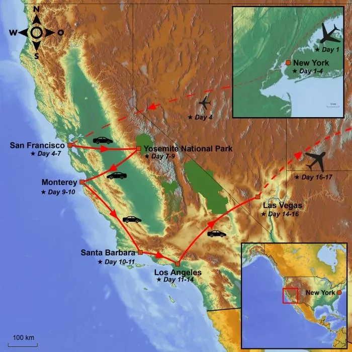 Look forward to visiting NYC before the great contrasts of the western USA beckon. Gems like San Francisco, Yosemite, Highway 1, and Los Angeles await you. Round off your journey with a bang in the desert city, Las Vegas.