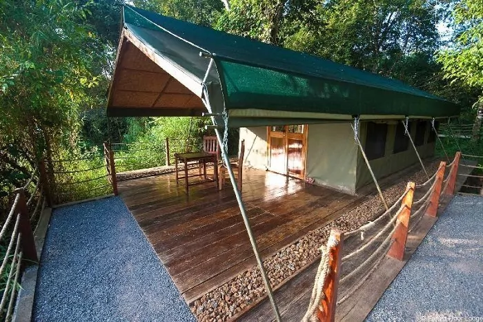 Accommodation is in luxury tents specially designed for tropical conditions. The tents are raised above the ground on a wooden platform and command an excellent view of the Ben Cu rapids. The tents are linked to the main building at the lodge by a network of walkways. All tents are equipped with either one double bed or two singles and have their own bathroom, air conditioning, a fan and a minibar. In front of each tent there is a charming balcony furnished with a couple of chairs – perfect for admiring the sunrise over the river and listening to the call of the gibbons.