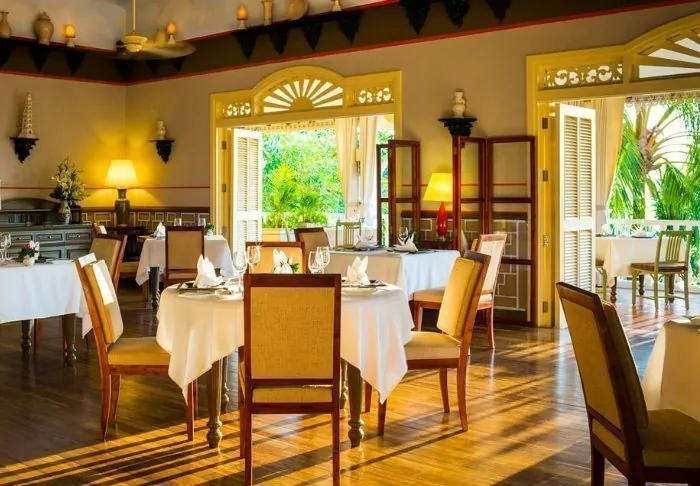 The resort is constructed in an elegant French colonial style and is surrounded by tropical gardens. This elegant French style can also be found in its 70 tastefully-decorated rooms, all of which feature Wi-Fi, air conditioning, a safe, TV, refrigerator, mini-bar, tea and coffee facilities as well as a bathroom. From your balcony, you have a view of its beautiful gardens.