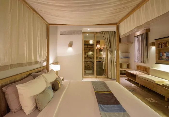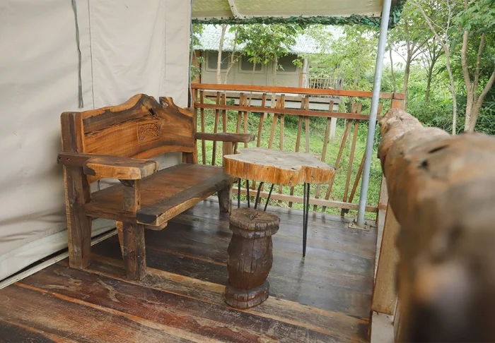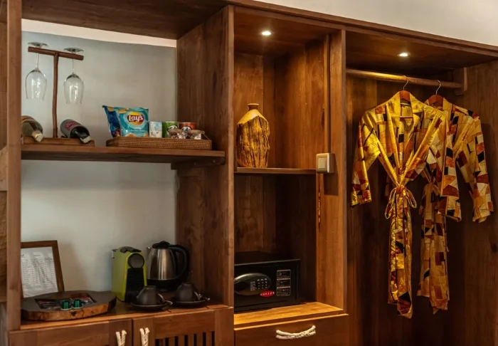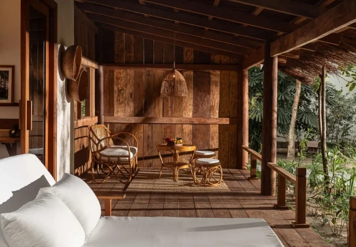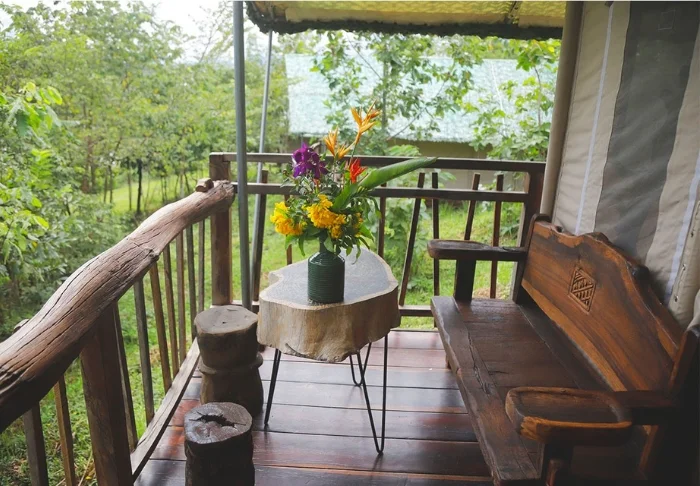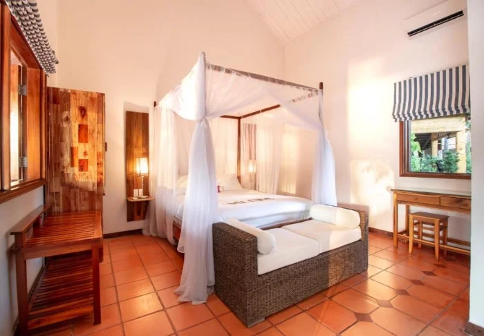 The lodge features charming bungalows built from natural materials, blending seamlessly into their tranquil surroundings. You’ll stay in a deluxe room set amidst the lodge’s flourishing gardens filled with blossoming plants and fruit trees. The room is approximately 40 m² and furnished with handmade pieces crafted from natural materials, creating a calm and authentic atmosphere. Here, you’ll find either a double bed or two single beds, air conditioning, a minibar, Wi-Fi, and a kettle so you can make tea or coffee. The spacious bathroom is fitted with modern amenities and features either an outdoor or indoor shower. From your private terrace, you can soak up the peaceful garden views and the serene atmosphere.