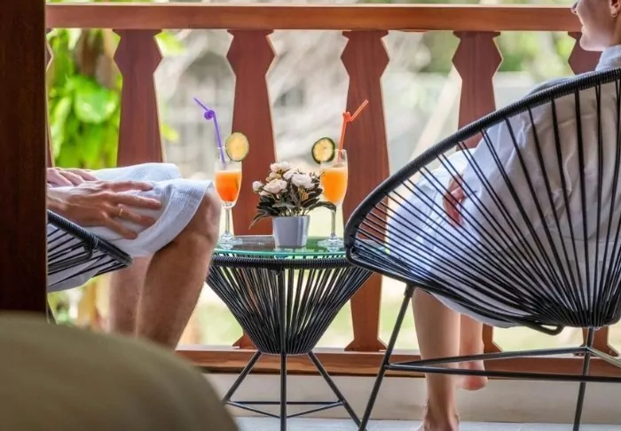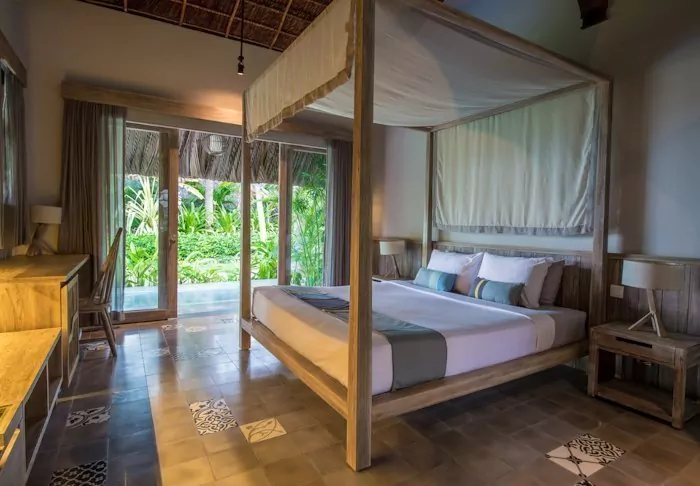 The Garden View rooms are situated in cosy pavilions nestled amidst the vibrant gardens. They are bright and furnished with bamboo furniture, mosquito nets draped over the beds, and colourful cushions that create a warm and inviting atmosphere. Large windows let the outdoors in, and from your private terrace, you can soak up the peace and admire the lush surroundings.