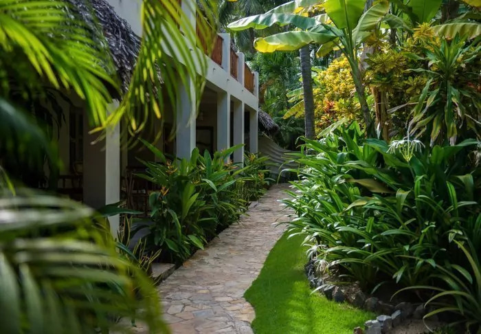 The resort’s 30 rooms are located in bungalows spread throughout the lush garden, with its rippling water, colourful flowers and small shady corners where you can laze.