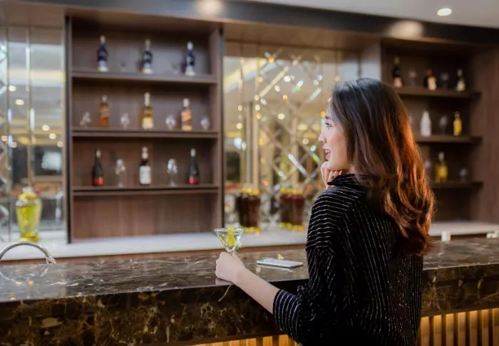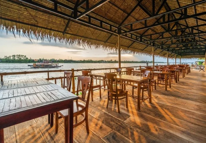 The hotel bar is the perfect place to relax with a refreshing drink while enjoying the view of the Hau River.