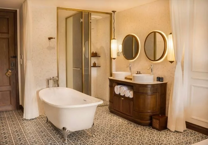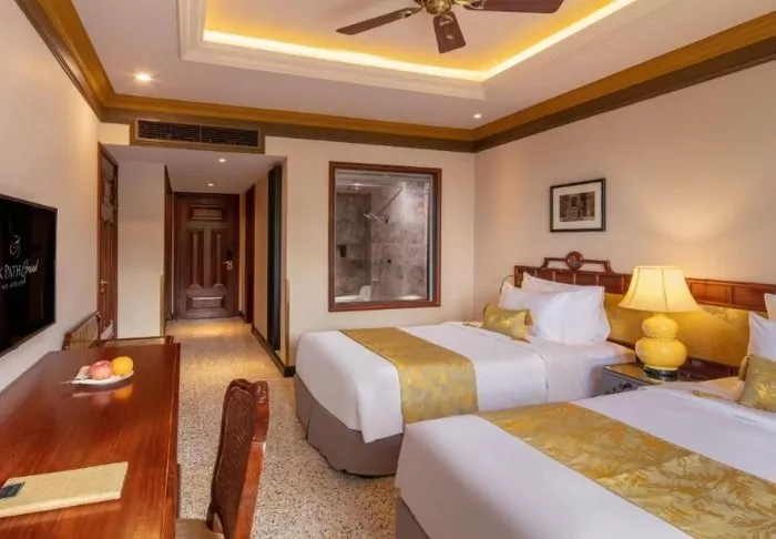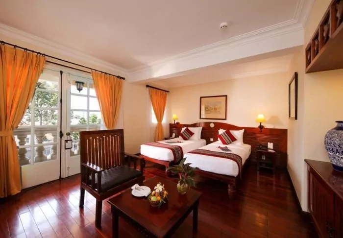Your stay begins in a superior room, blending modern comfort with a touch of Vietnamese elegance. The rooms feature large windows letting in natural light, as well as wooden details and classic furnishings that create a warm and inviting atmosphere. Particularly striking are the wall panels adorned with blooming cherry branches, lending a local, artistic flair. All rooms are equipped with a double bed or twin beds, fridge, TV, safety box, kettle, air conditioning, and a private bathroom with toiletries and a hairdryer. Thoughtful touches throughout provide a calm retreat, making it easy to unwind after a day of exploring.
