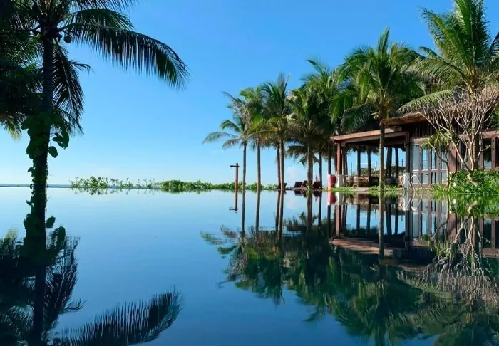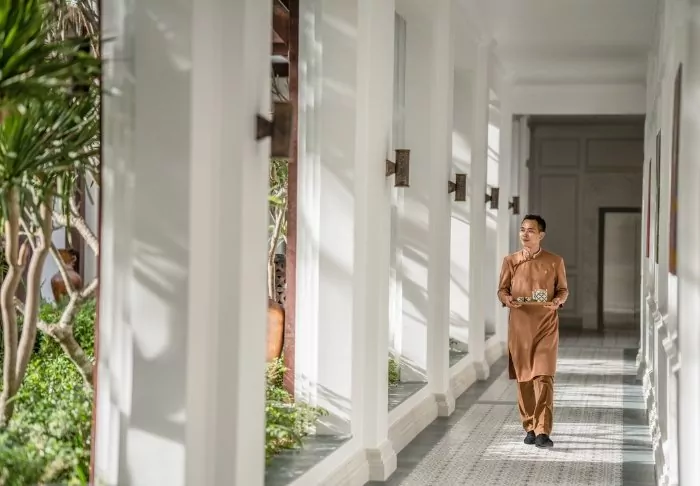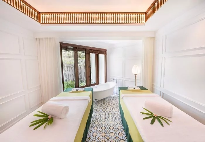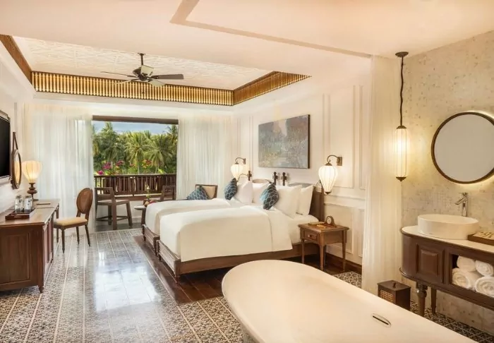 The hotel is built in a modern Vietnamese colonial style and offers just 37 rooms, ensuring an intimate and relaxed atmosphere. You’ll stay in a superior room as standard, which is bright and tastefully furnished with wooden décor, large windows, and subtle details inspired by Hoi An’s distinctive aesthetic. Your room will include air conditioning, Wi-Fi, a minibar, a kettle, a safety box, and a TV. The bathroom is equipped with a rainfall shower and complimentary toiletries.