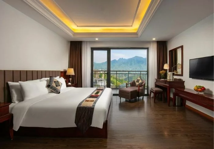 The hotel has 103 rooms, all of which overlook Ham Rong Mountain and Sapa Lake. They are modernly appointed in calm colours and offer air conditioning, a TV, Wi-Fi, a safe, a minibar, a dressing table/desk and a kettle for tea and coffee.