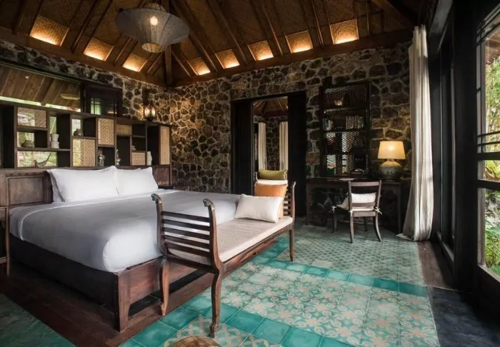You’ll stay in a Garden Cottage, accessible via meandering paths through the hotel’s lush, palm-shaded gardens blanketed in blooms. From your terrace, you’ll overlook your own little garden—if you’re lucky, you might spot ripening passion fruit, or bright orchids and hibiscus. The room itself is simply styled, with stone floors and large windows that flood the space with natural light. You’ll also have a four-poster bed with a mosquito net, air conditioning and a ceiling fan, Wi-Fi, a minibar, tea and coffee facilities, a safety box, and a bathroom with a rainfall shower, hairdryer, and toiletries—everything you need for a truly relaxing stay.