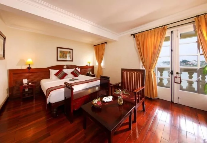 You’ll stay in a superior room, decorated in a Vietnamese style with dark wood furnishings that create a warm and inviting atmosphere. The rooms come equipped with modern conveniences such as air conditioning, Wi-Fi, a minibar, tea and coffee-making facilities, a safety box, and a flat-screen TV, offering everything you need for a comfortable stay. The bathroom features a shower, bathrobe, hairdryer, and toiletries.