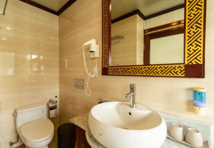 The ship features 24 cabins across two decks, each inspired by traditional Vietnamese craftsmanship and culture. Cabins are adorned with dark wood panelling, intricate décor, and large panoramic windows overlooking the bay. All are equipped with air conditioning, a minibar, a safety box, tea and coffee facilities, and a bathroom with both a bathtub and separate shower. These spacious cabins combine warm materials with modern comforts, providing an inviting retreat between each day’s adventures.