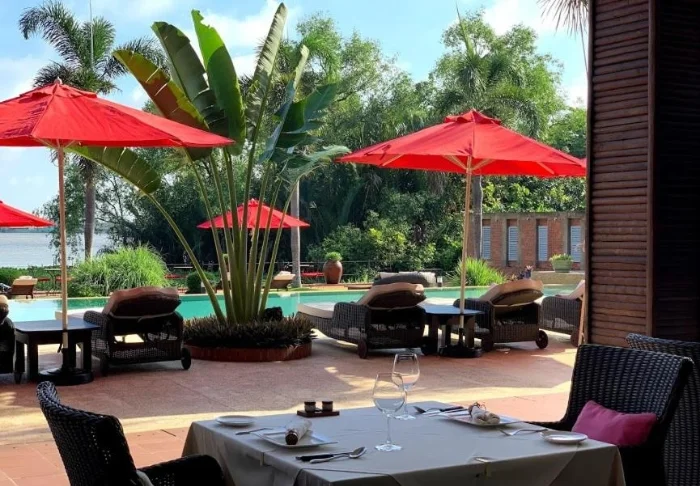 The resort boasts a beautiful garden filled with lush palms and colourful flowers, as well as an outdoor pool where you can swim or simply relax in the shade, taking in views of the river. If you’re keen to explore, the resort offers bicycle hire and can help organise trips out into the labyrinthine waterways of the delta.