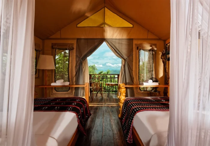Lak Tented Camp sits peacefully on the shores of Lak Lake, surrounded by lush green mountains and rice fields, around 50 km south of Buon Ma Thuot. The adventure begins with your arrival by boat. Even as you glide across the lake, you’ll immediately notice what sets this place apart: the tranquillity, the natural beauty, and a true sense of being far from it all.