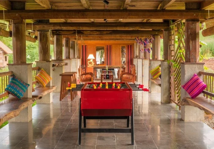 You’ll stay as standard in a deluxe bungalow built on stilts. The décor is simple, with tiled floors, dark wooden furniture, and large windows that let in plenty of light. The bungalow comes equipped with air conditioning, Wi-Fi, a TV, a minibar, a safety box, and a kettle. The bathroom features both a shower and a hairdryer. On your private balcony, you can take in beautiful views of the rice paddies and mountains while enjoying a cup of tea or coffee.