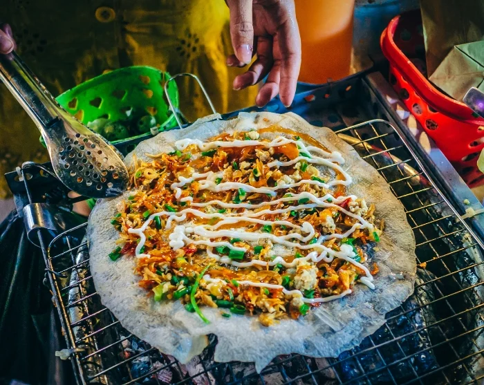 Your culinary journey finishes with a bowl of hu tieu – a noodle dish served either as a soup or dry – and the ever-popular street food dish bot chien. This treat features small cubes of fried rice flour – crispy on the outside and soft in the centre – fried together with egg and spring onion, accompanied by a sweet-sour soy-based sauce and freshly grated papaya. It’s a simple yet incredibly tasty dish, enjoyed by many locals as a late-night snack.
