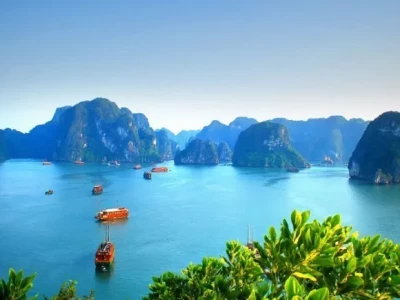 In the 1,500 km² bay, green-clad limestone cliffs protrude from the sea, which varies from deep blue to jade green depending on the season.