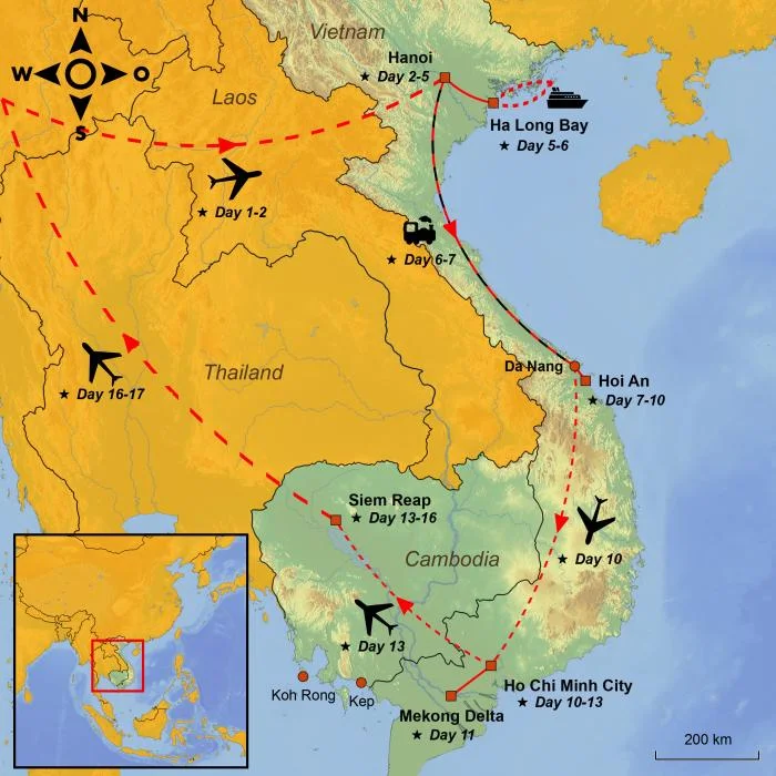 The classic tour in which you experience the contrasts from north to south in Vietnam spiced with the charming Siem Reap and the world-class attraction of Angkor Wat in Cambodia.
