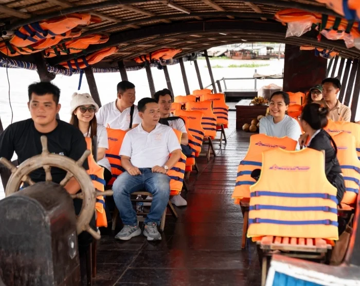 Your boat journey continues to a tranquil island in the heart of the Mekong River, where you’ll savour a Vietnamese lunch prepared with fresh, local ingredients, surrounded by lush greenery and the gentle rhythm of the river’s life.