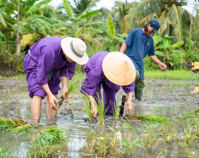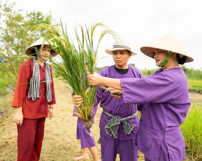 Your tour then takes you to our social sustainability project in Vinh Long, established by our local partner. Here, a peaceful walk through the village awaits, with your guide offering insights into the project as you go. You’ll also have the opportunity to experience traditional rural life firsthand. Together with local farmers, you’ll get involved in rice cultivation – either planting young seedlings or helping with the harvest, depending on the season. This hands-on and enlightening activity provides a unique glimpse into daily life in rural Vietnam and the dedication that drives sustainable farming. By taking part in this tour, you’ll also be supporting families in Vinh Long, as a percentage of the tour price goes directly towards the project, which you can learn more about here.