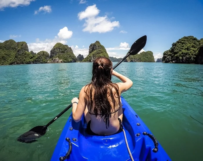 Once on board, you’ll be greeted with a refreshing drink, and the crew will offer a brief introduction to the adventure that awaits. You can then settle into your cabin and get ready for a delicious lunch featuring both Vietnamese delicacies and international favourites. As you dine, the boat will gently glide out onto the emerald waters, giving you the chance to admire some of Ha Long Bay’s most iconic limestone formations—Incense Burner, Dog Stone Islet, Fighting Cock Islet, and Three Coconuts Island.