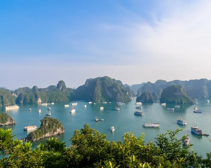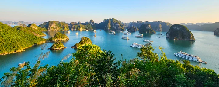From Hanoi, you’ll head east towards Ha Long Bay, where you’ll set sail on a mini cruise among striking limestone cliffs. Visit Ti Top Island—with the chance for a swim and panoramic views from the summit—explore an impressive limestone cave, spend the night on board, and awaken to the morning light shimmering over emerald-green waters.