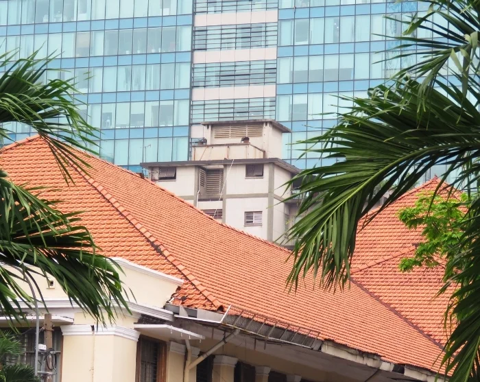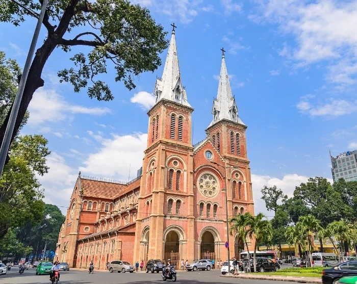 Directly opposite the Old Post Office stands the iconic Notre Dame Cathedral, built between 1863 and 1880. This impressive landmark from the French colonial era is distinguished by its striking red brick façade and soaring spires.