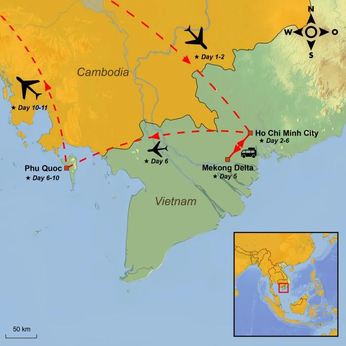 Experience the diversity of southern Vietnam, from the vibrant urban energy of Ho Chi Minh City to boat trips along the Mekong Delta, including a visit to our social sustainability project in Vinh Long. Round off your adventure with a relaxing beach holiday on the island of Phu Quoc.