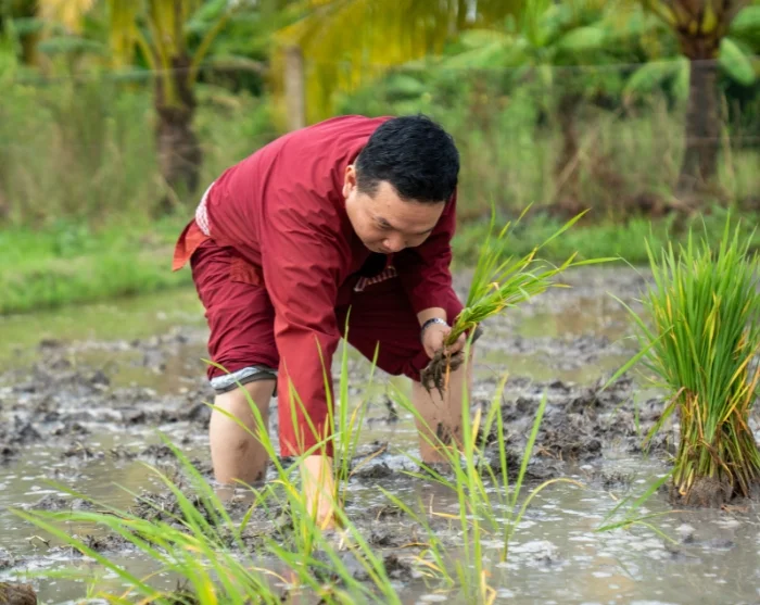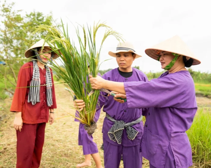 Your tour then takes you to our social sustainability project in Vinh Long, established by our local partner. Here, a peaceful walk through the village awaits, with your guide offering insights into the project as you go. You’ll also have the opportunity to experience traditional rural life firsthand. Together with local farmers, you’ll get involved in rice cultivation – either planting young seedlings or helping with the harvest, depending on the season. This hands-on and enlightening activity provides a unique glimpse into daily life in rural Vietnam and the dedication that drives sustainable farming. By taking part in this tour, you’ll also be supporting families in Vinh Long, as a percentage of the tour price goes directly towards the project, which you can learn more about here.