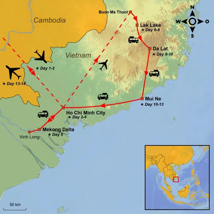 Discover the charm of the Mekong Delta, the peaceful beauty of Lak Lake, and the enchanting cool highlands of Da Lat – all framed by vibrant city life in Ho Chi Minh City and the palm-fringed beaches of Mui Ne.
