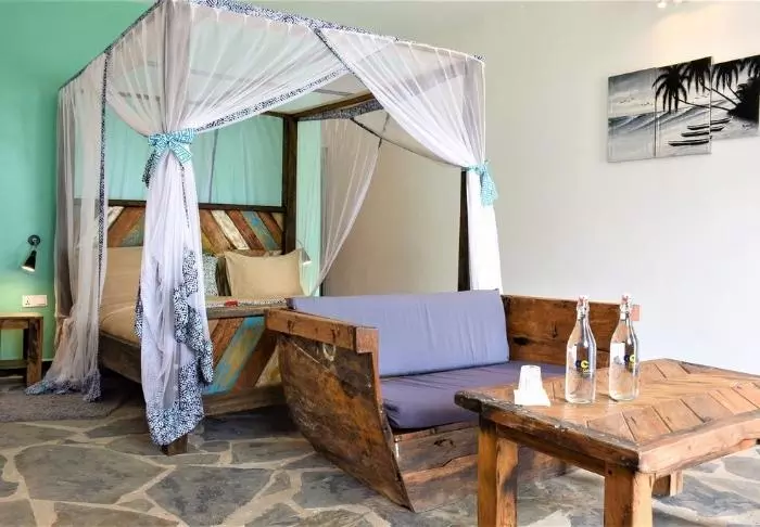 There are 96 rooms, all of which have mosquito nets, air conditioning, a safe, a terrace and free Wi-Fi. They are decorated in traditional Zanzibar style with colourful cushions and local art on the walls.